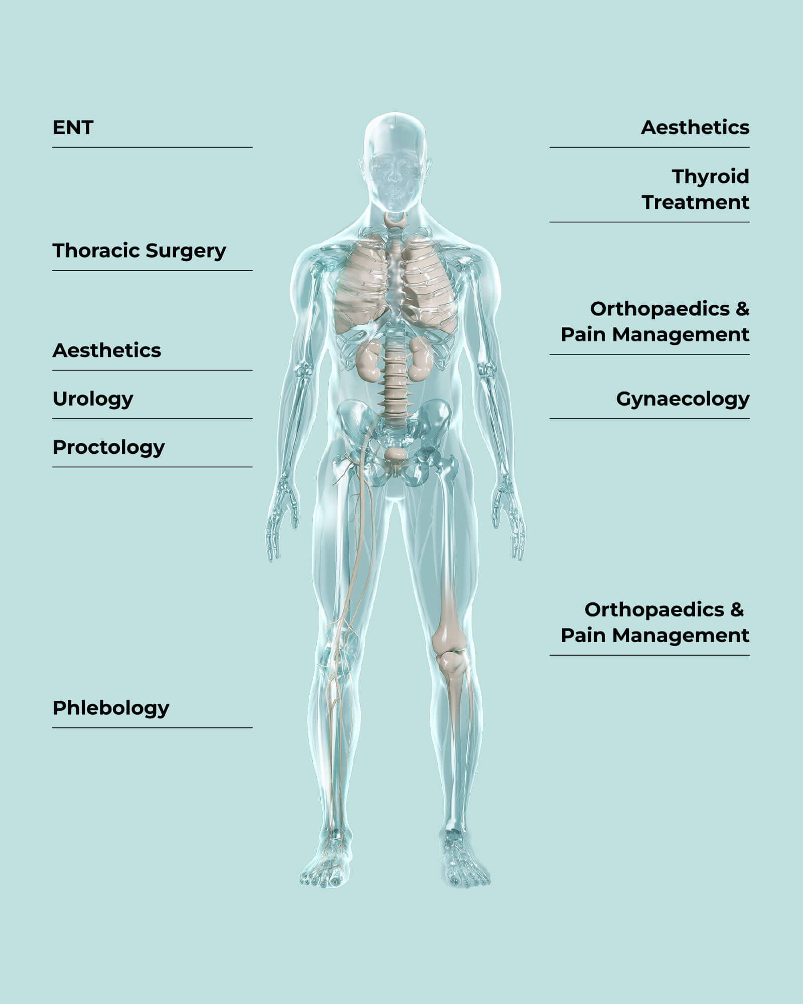 • Proctology: Minimally invasive laser treatments for hemorrhoids (LHP®), anal fistulas (FiLaC®), sinus pilonidalis (SiLaC®), condylomas, anal fissures, and anal intraepithelial neoplasia (AIN).